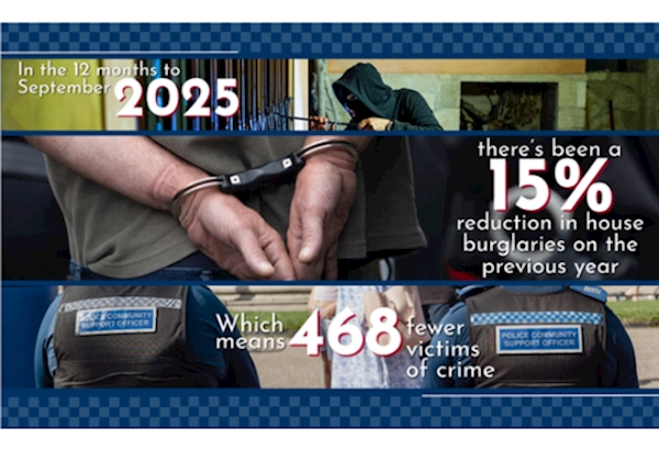 Preventative and proactive approach leads to reduction in house burglaries.House burglaries across much of the force area fell by 16% this September when compared with September last year - a reduction of 42 crimes. And longer term there’s been a 15% reduction on the previous 12 months which equates to 468 fewer victims. The drop’s being attributed to the force making sure preventative and proactive measures are in place, with each policing district making use of specialist officers and staff including crime analysts, intelligence officers and neighbourhood officers who work with local partner agencies and our communities to identify suspects.