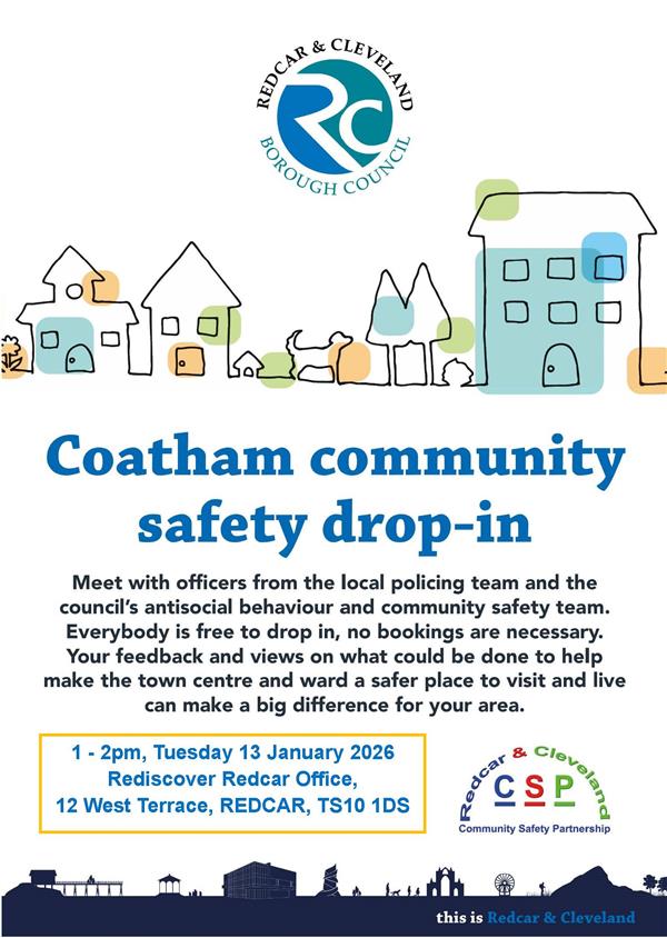 The next Coatham community safety drop in is on 13th January. Come along if you want to speak about local issues to local PCSOs and RCBCs ASB team. | ||